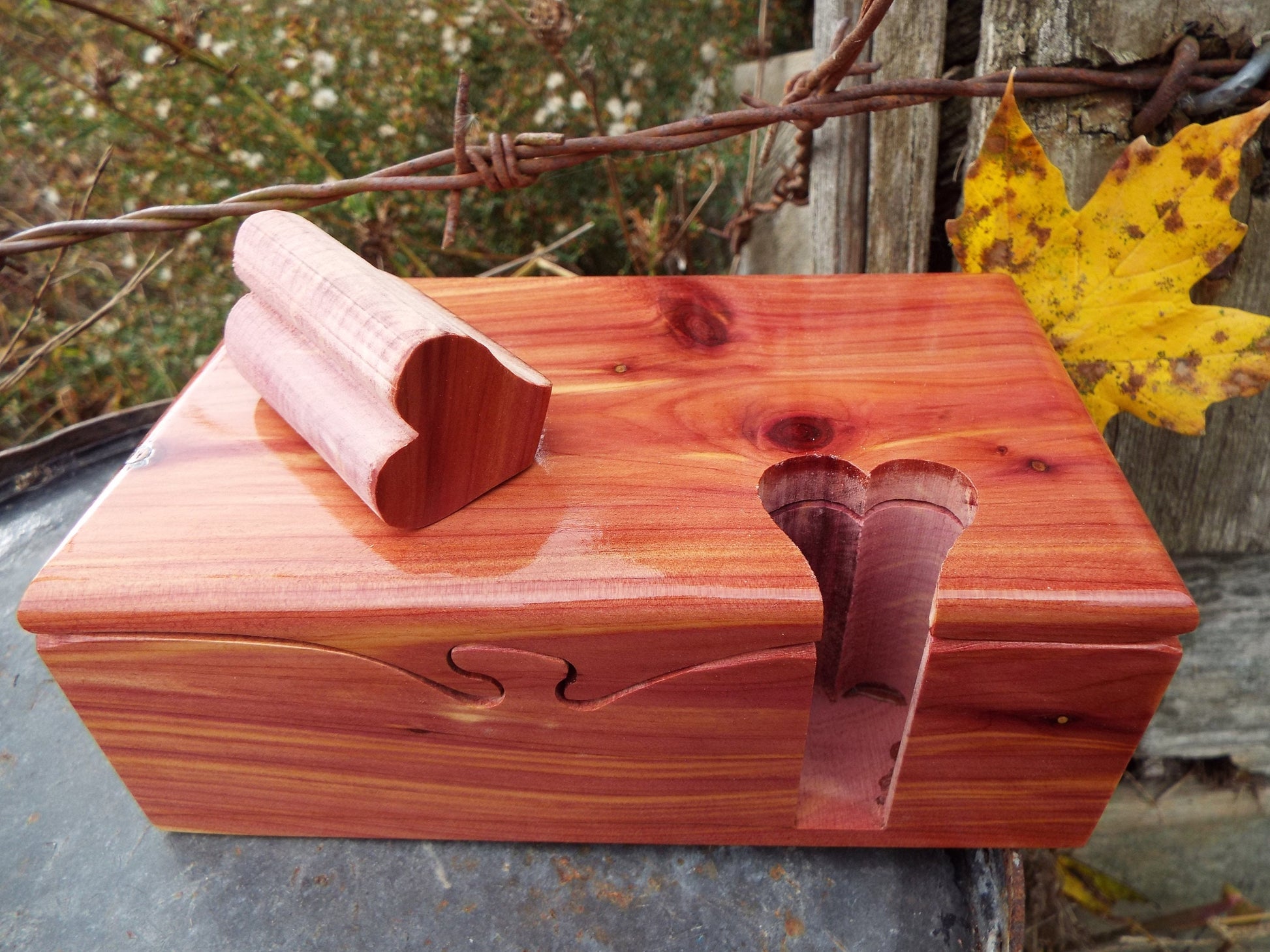 Measures approximately 3 1/2" x 6" and 2 1/4+" in height. Each unique one of a kind box is made from aromatic cedar. It has no stains or dyes. All color is naturally occurring.