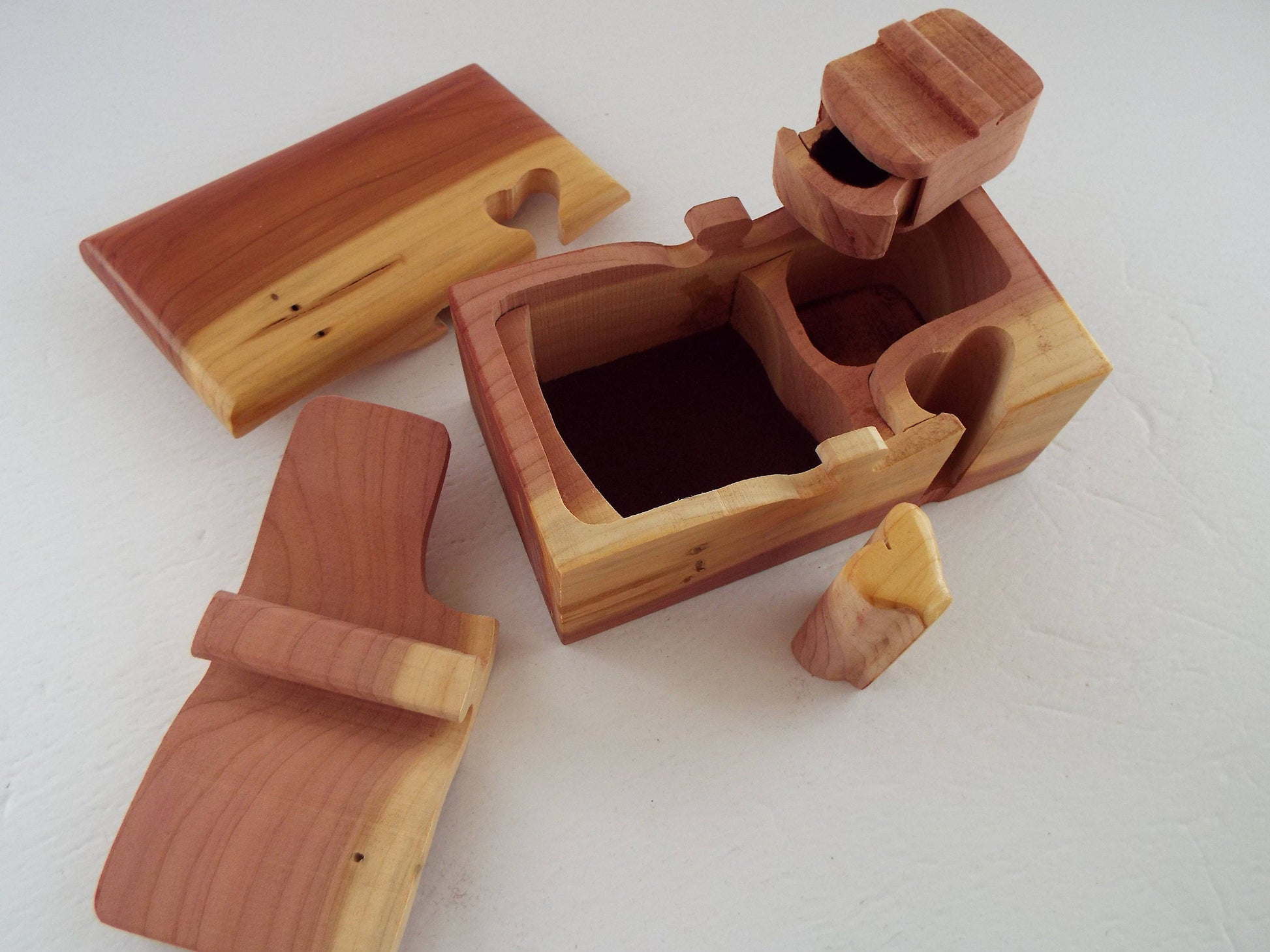 The exterior of this piece is hand finished semi gloss. Interior surfaces are unfinished leaving the wonderful smell and look of aromatic cedar. The interior of this box can be LIGHTLY sanded to refresh the cedar aroma. Interior compartment only has flocking on bottom of compartment and drawer of inner box.